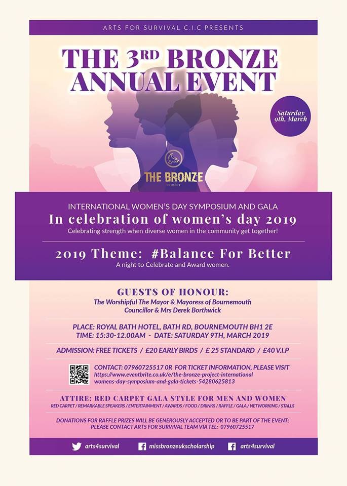 9/03/19 – I will be celebrating International Women’s Day this year by attending as one of the speakers for The 3rd Bronze Annual Women event to be held at The Royal Bath Hotel Bournemouth The theme this year is #balanceforbetter. I will be giving a talk on #balanceforbetter/relationships This event is organised by Arts 4 Survival Community Interest Company